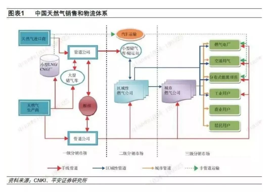 我國目前天然氣市場大致可以分為三級分銷體系。一級分銷體系主要是天然氣生產(chǎn)商和進口商銷售給區(qū)域燃氣公司;二級分銷體系主要為區(qū)域燃氣公司到城市燃氣公司;三級分銷體系主要是城市燃氣公司銷售給終端用戶,包括燃氣電廠、加氣站、分布式能源項目、工商業(yè)用戶和居民用戶等。