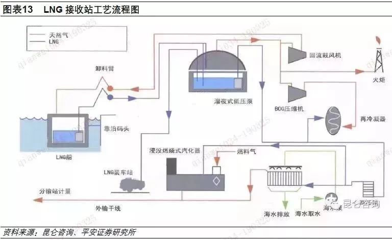 LNG的進口需要在符合條件的港口建設LNG接收站,LNG接收站主要包括LNG碼頭和LNG儲罐區(qū),是各國儲存、裝卸進口LNG并輸送至國內的必要地面設施。LNG接收站的主要功能是將從海外船運進口的液化天然氣通過碼頭接收到儲罐中,然后通過接收站的氣化裝置,將液態(tài)的天然氣重新氣化成為氣態(tài)的天然氣,再通過外輸管道向下游城市燃氣用戶、燃氣發(fā)電用戶和企業(yè)用戶輸送。還有一部分可以直接將儲罐中的液態(tài)天然氣重裝到液化天然氣槽車中,將液態(tài)的天然氣通過槽車運送到液化天然氣加氣車或者小型的氣化站。