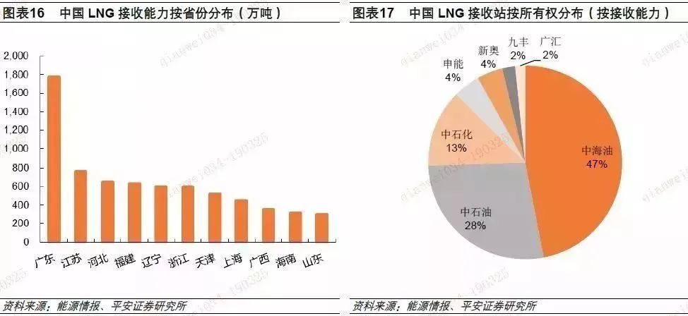 中國已投產(chǎn)的21座LNG接收站分布在沿海11個省/直轄市,其中廣東是我國接收能力最大的省份之一,截止2018年底,接收能力約1800萬噸/年。從所有權來看,中海油占據(jù)全國總接收能力的47%,中石油占據(jù)28%,中石化占據(jù)13%,其余還有申能股份、新奧集團、九豐以及廣匯能源等。